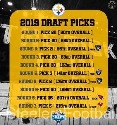 As previously reported, the Steelers currently have 10 picks in the draft after receiving a third and fifth round selection from the Raiders for Antonio Brown and a sixth-round pick from the Cardinals for Marcus Gilbert. Pittsburgh also traded their seventh round selection to the Cleveland Browns as part of a deal for Sammie Coates that saw them receive a sixth round draft pick in 2018. Their seventh round selection this year comes from the Tampa Bay Buccaneers as part of the trade for J.J. Wilcox in 2017. The Steelers extra sixth-round pick (No.175 overall) comes as part of the trade for Ryan Switzer in 2018.